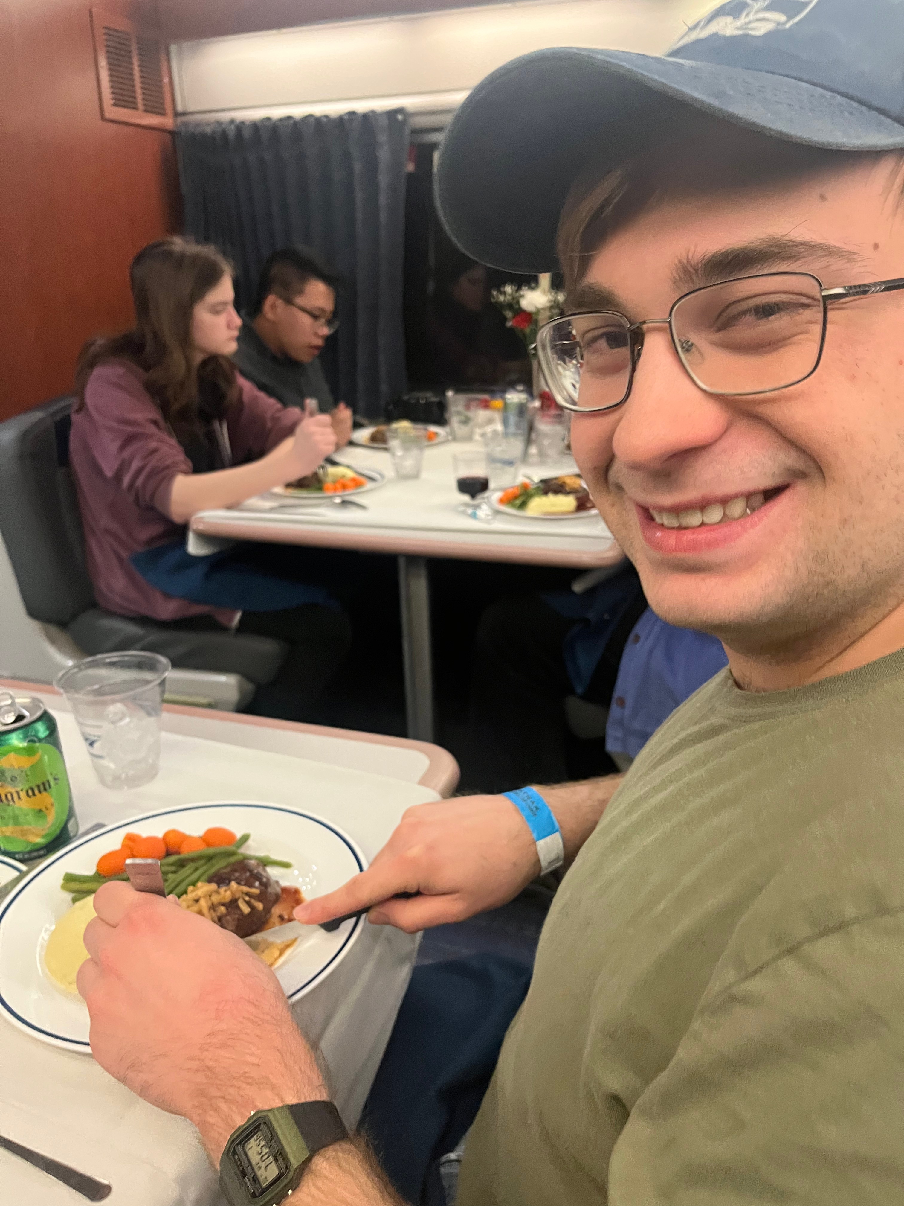As soon as the dining car attendant took our dinner order, we ran to the observation car. I was in a rush because I remembered how hard it was to get a seat on the California Zephyr, but when we got there, we realized there was definitely no rush. Since we took this train in the winter and not during peak summer travel season, there was little to no competition for a seat. We decided to stay until the sun set to enjoy the first day views, pointing out all the cool things we saw (mostly families of deer) and making fun of the cars stuck behind the train gate while we passed. When we eventually returned for dinner, I noticed the tables were decorated with red and white carnations and baby’s breath instead of the usual roses. Whether it was a supply issue or a seasonal choice, I appreciated the commitment to the color scheme.