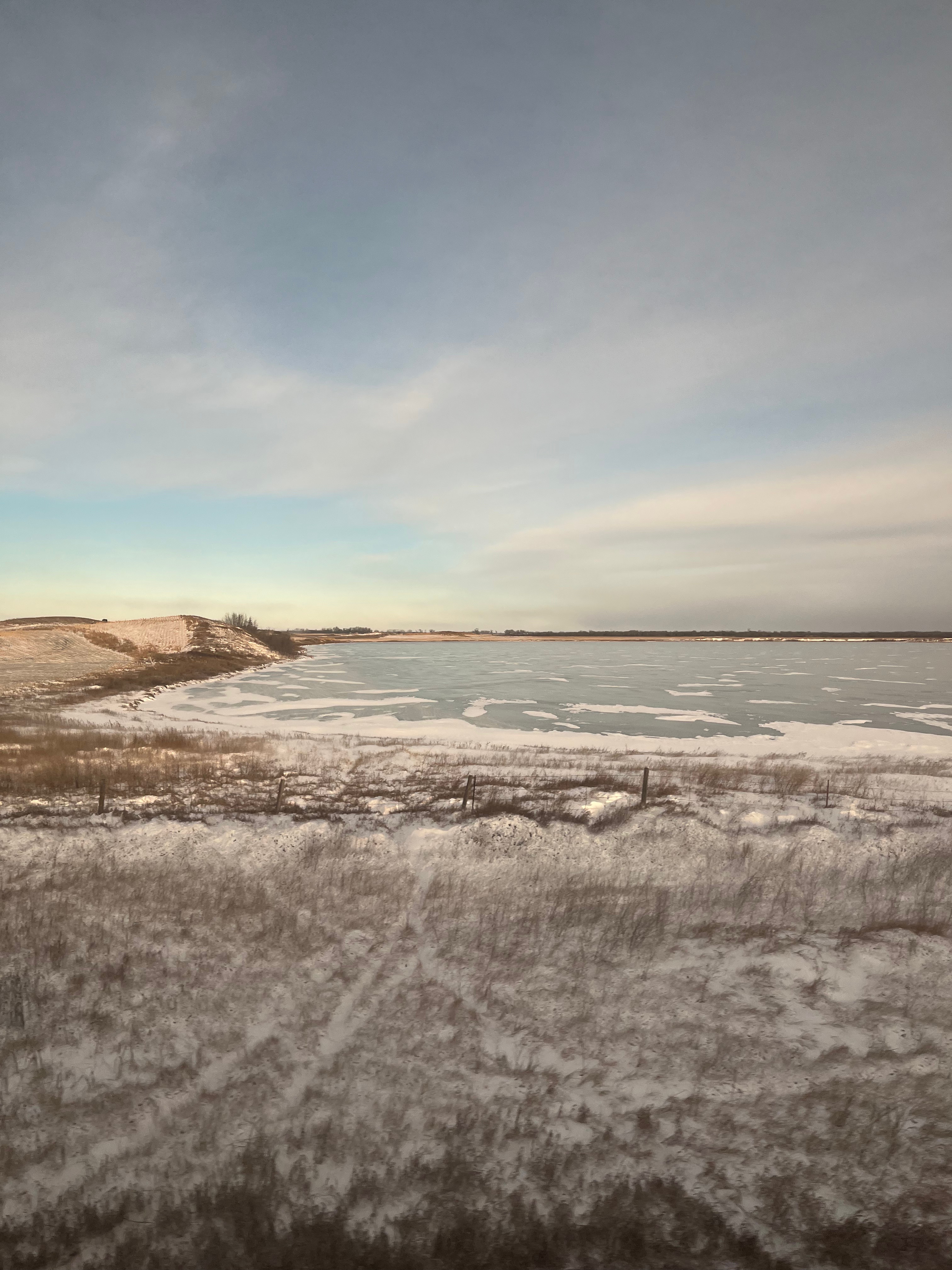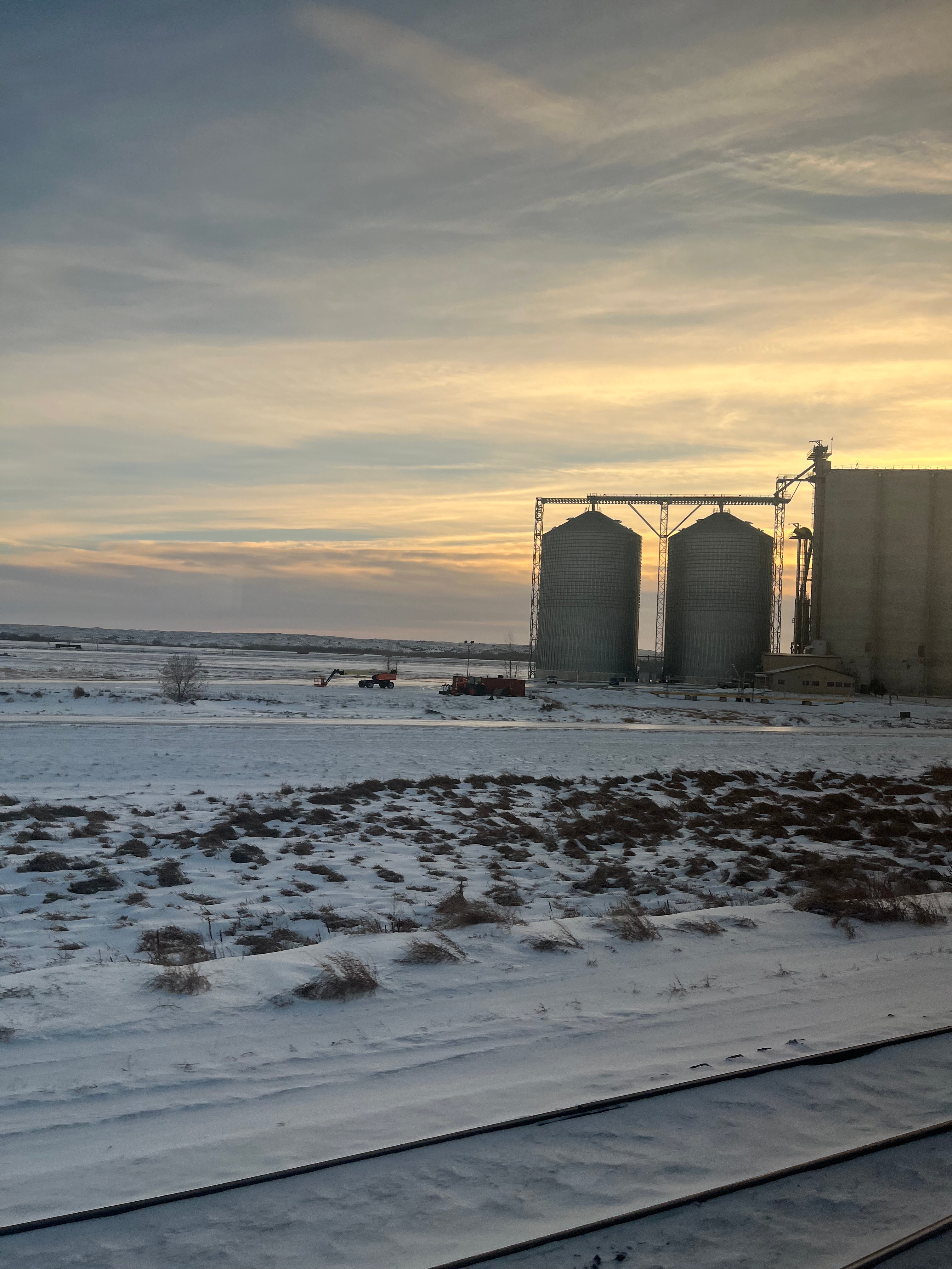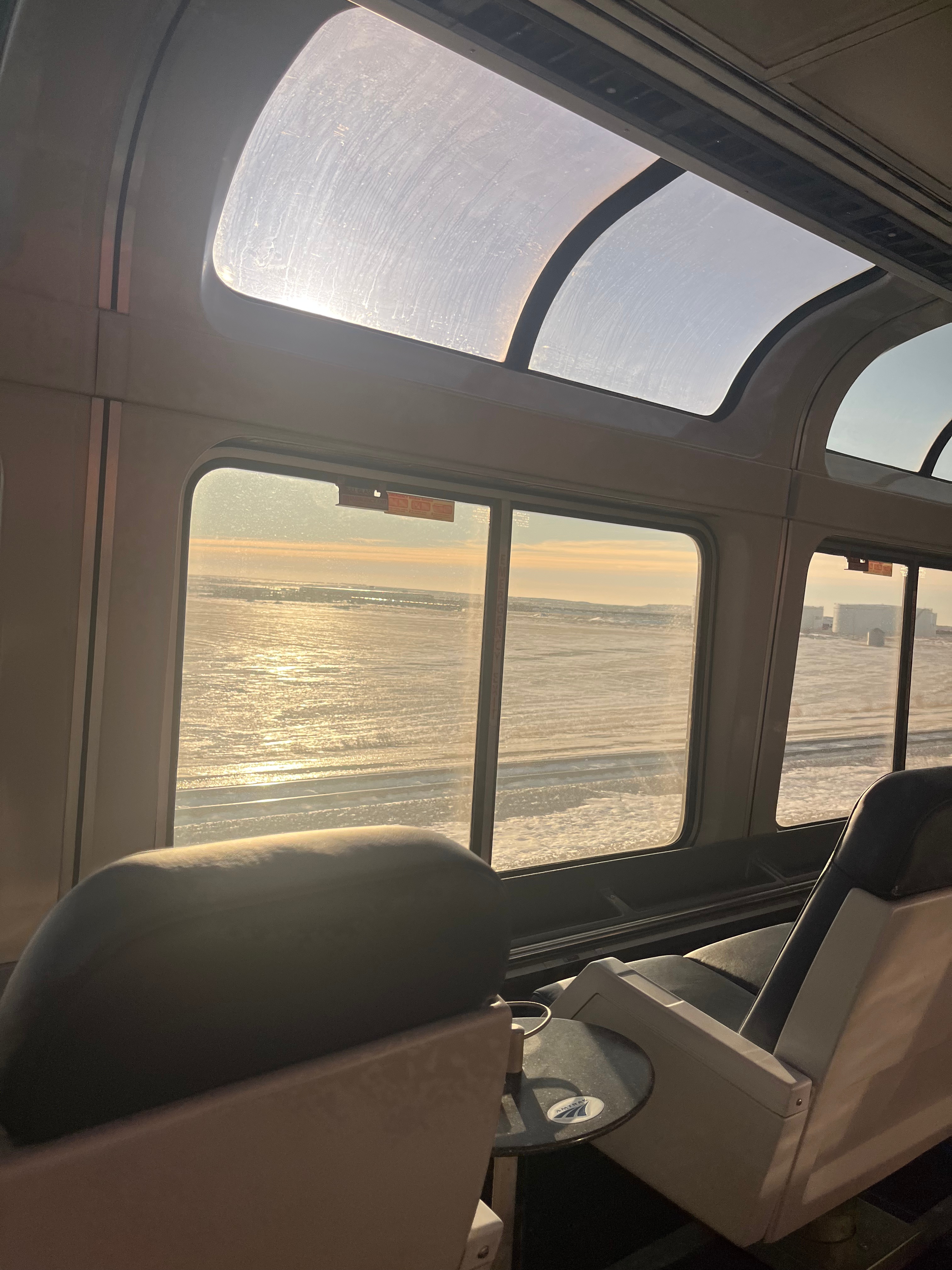 After breakfast, we made our usual (and again, unnecessary) dash to the observation car, where another conductor announcement reminded everyone that getting caught smoking would make you “really early for tomorrow’s train”. I don’t know if it was the same person who was smoking the day before, but I wouldn’t be surprised. Keeping that in mind, we kept looking out the massive windows. We saw even more frozen lakes, grain silos with chutes right above the train tracks to allow trains to collect the grain and go, massive snowbanks, houses with a bunch of trees surrounding them in the otherwise flat prairie, and cows with snow on top of them like cars left outside during a snowstorm. Rest assured these cows were totally fine, they really just didn’t care enough to shake off the snow.