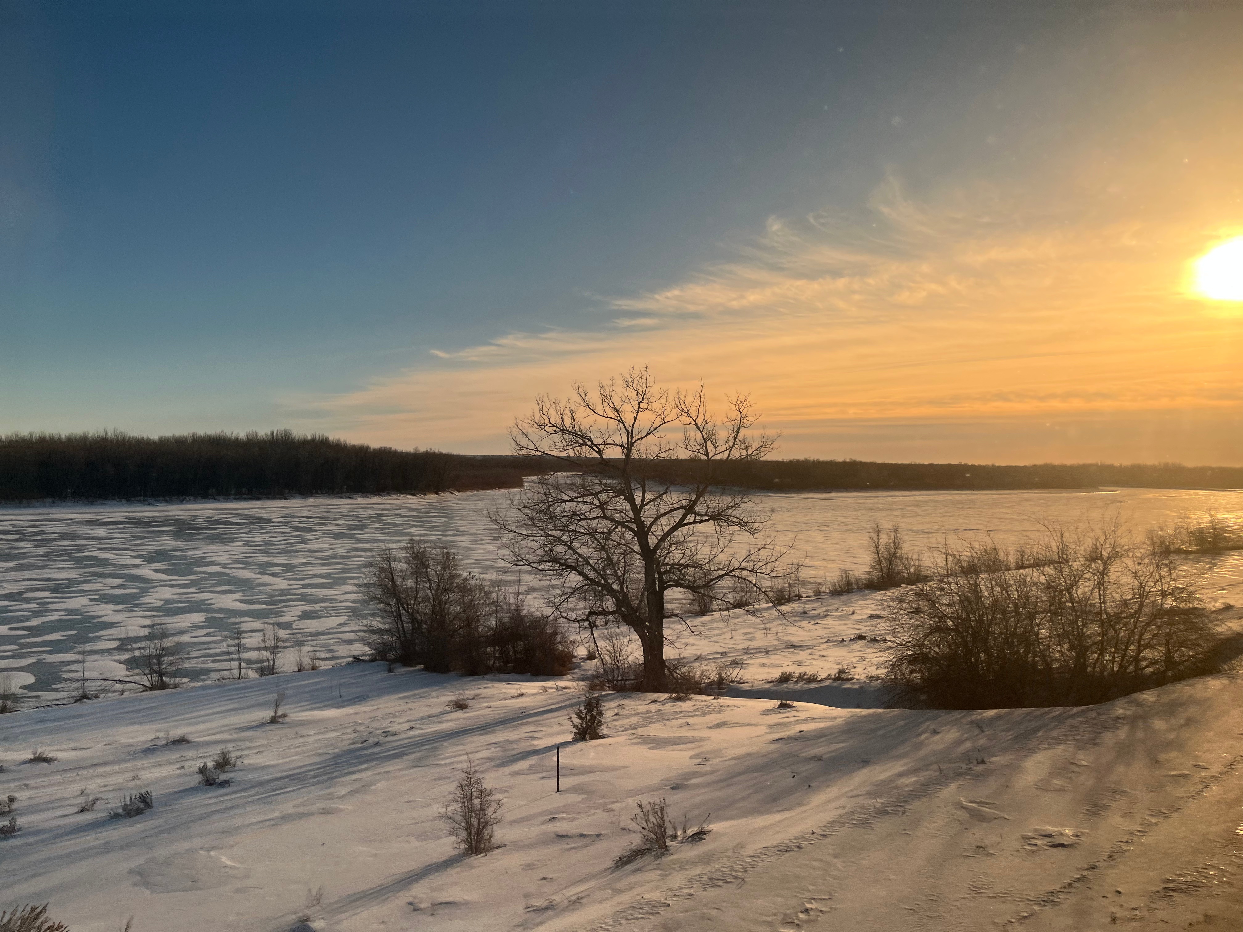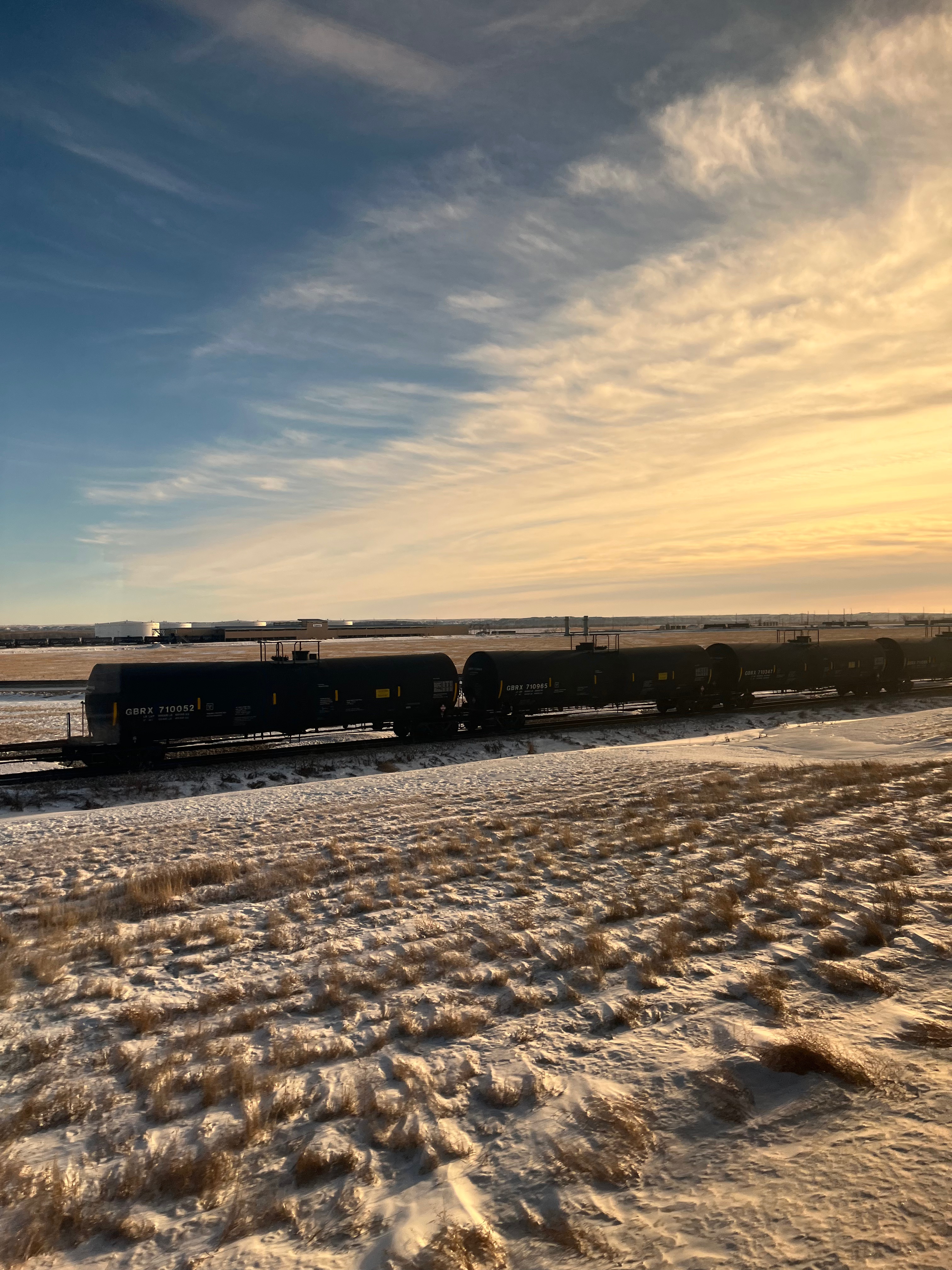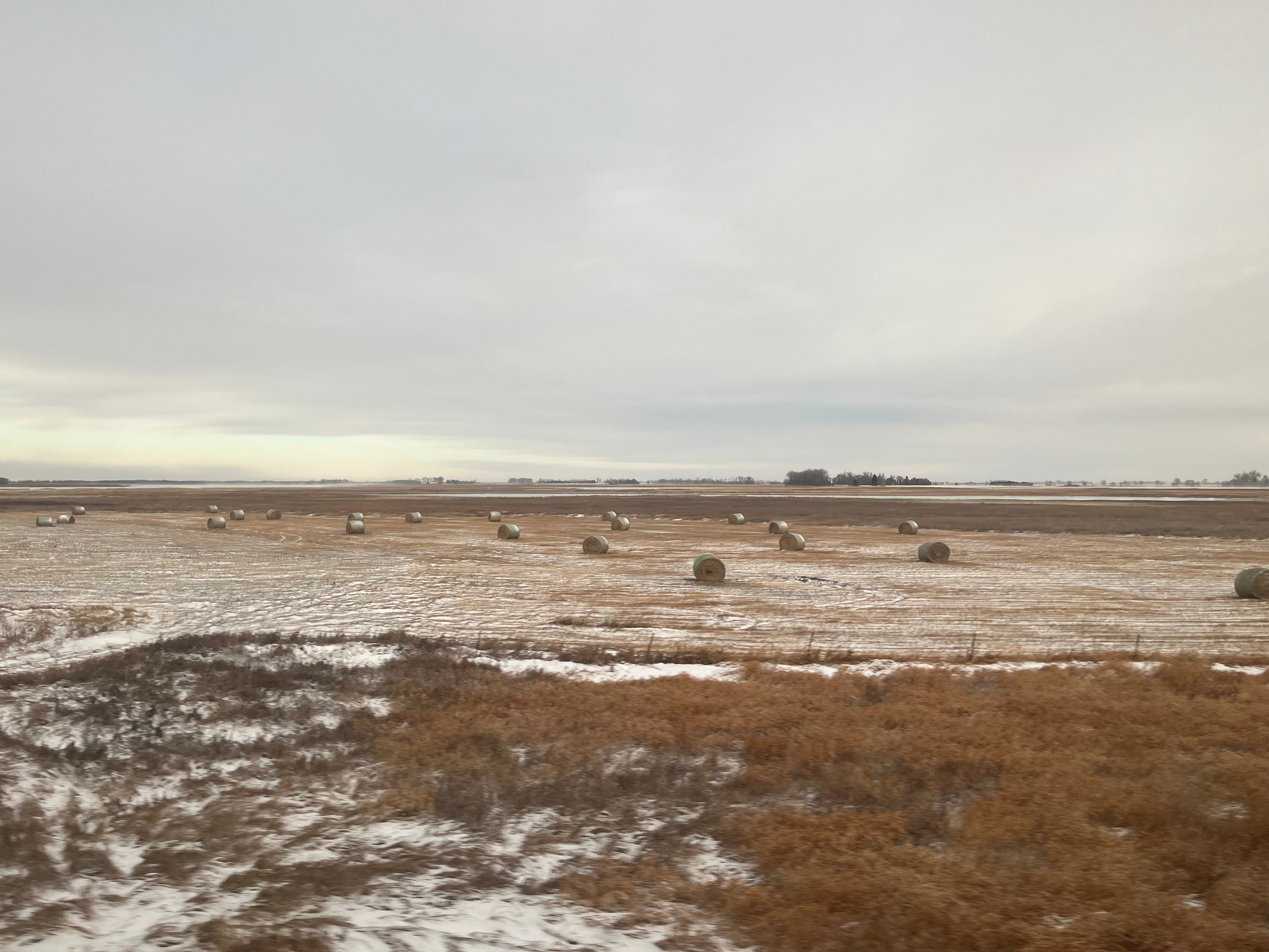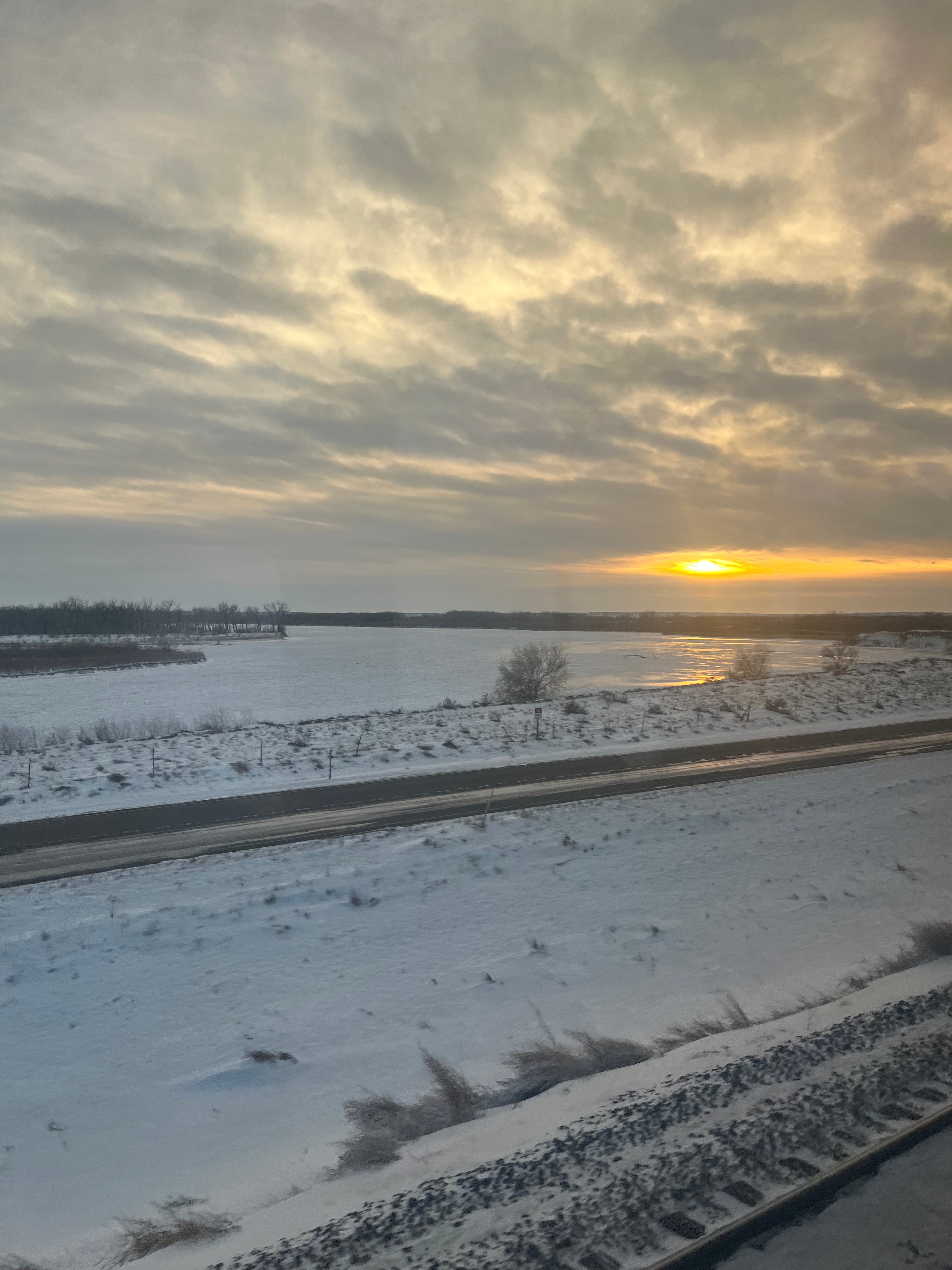 After breakfast, we made our usual (and again, unnecessary) dash to the observation car, where another conductor announcement reminded everyone that getting caught smoking would make you “really early for tomorrow’s train”. I don’t know if it was the same person who was smoking the day before, but I wouldn’t be surprised. Keeping that in mind, we kept looking out the massive windows. We saw even more frozen lakes, grain silos with chutes right above the train tracks to allow trains to collect the grain and go, massive snowbanks, houses with a bunch of trees surrounding them in the otherwise flat prairie, and cows with snow on top of them like cars left outside during a snowstorm. Rest assured these cows were totally fine, they really just didn’t care enough to shake off the snow.