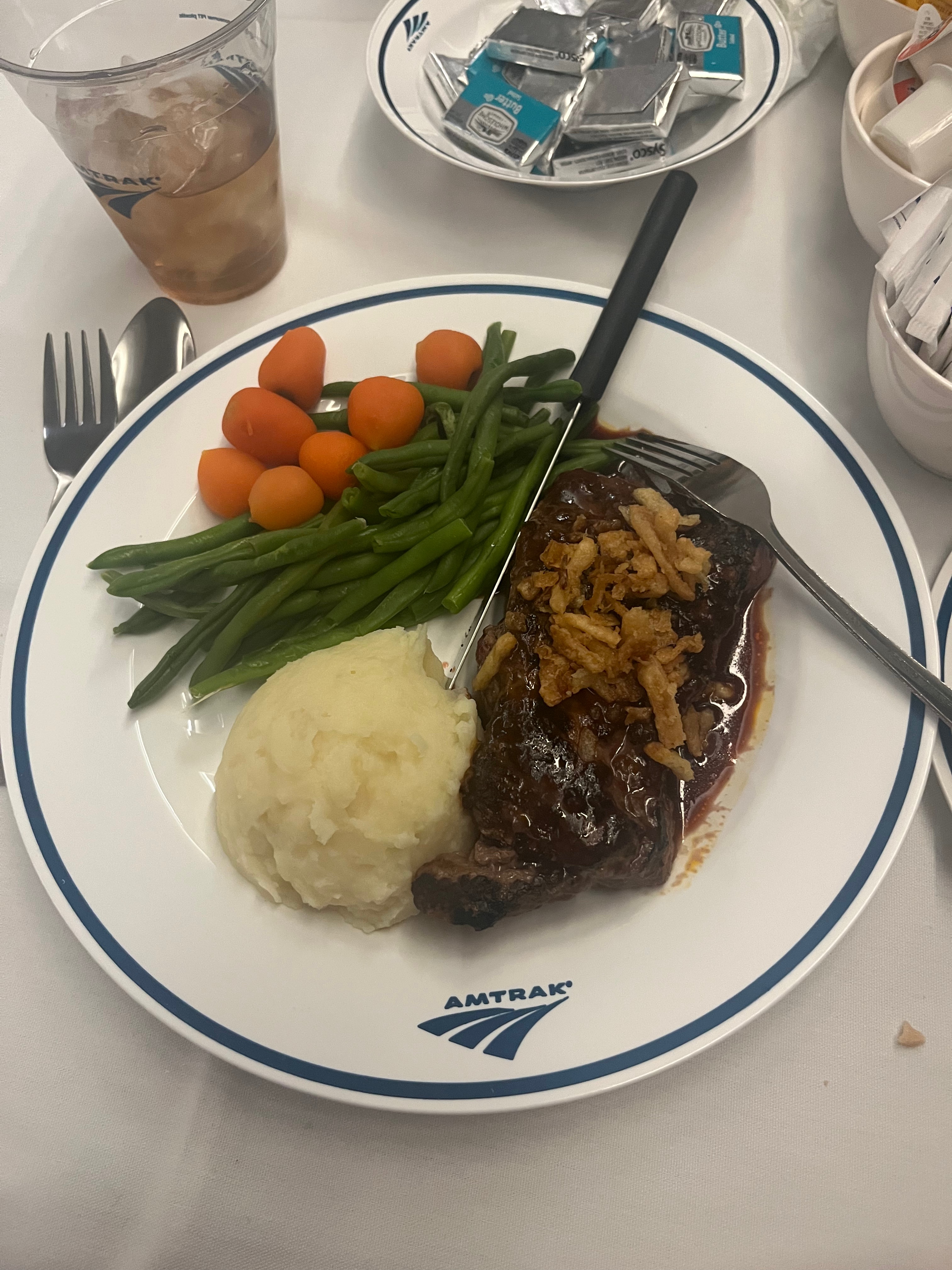 We finally reached Minot, though not without more waiting. The eastbound Empire Builder was already occupying the station, which also doubles as a maintenance and inspection stop, meaning every train is scheduled to linger there. In total, we sat for a couple of hours before moving again. Once underway, the hours long afternoon light and sunset worked in our favor to make an otherwise somewhat uneventful part of the journey more beautiful as we passed oil fields and small towns. After dark, we headed to the dining car, where I felt obligated to try the Amtrak steak (or Amsteak if you will). If you didn’t know, the steak is the only dish cooked to order rather than just heated up. I’m not a big steak person in general, but it felt like a crime not to order it at some point.