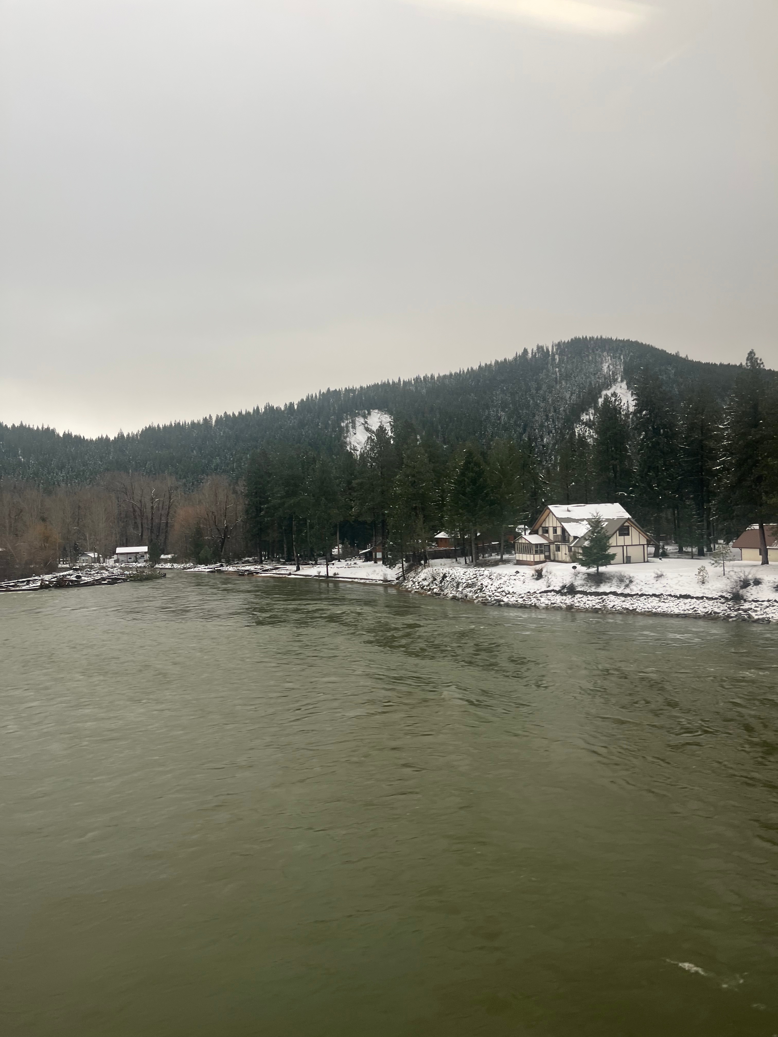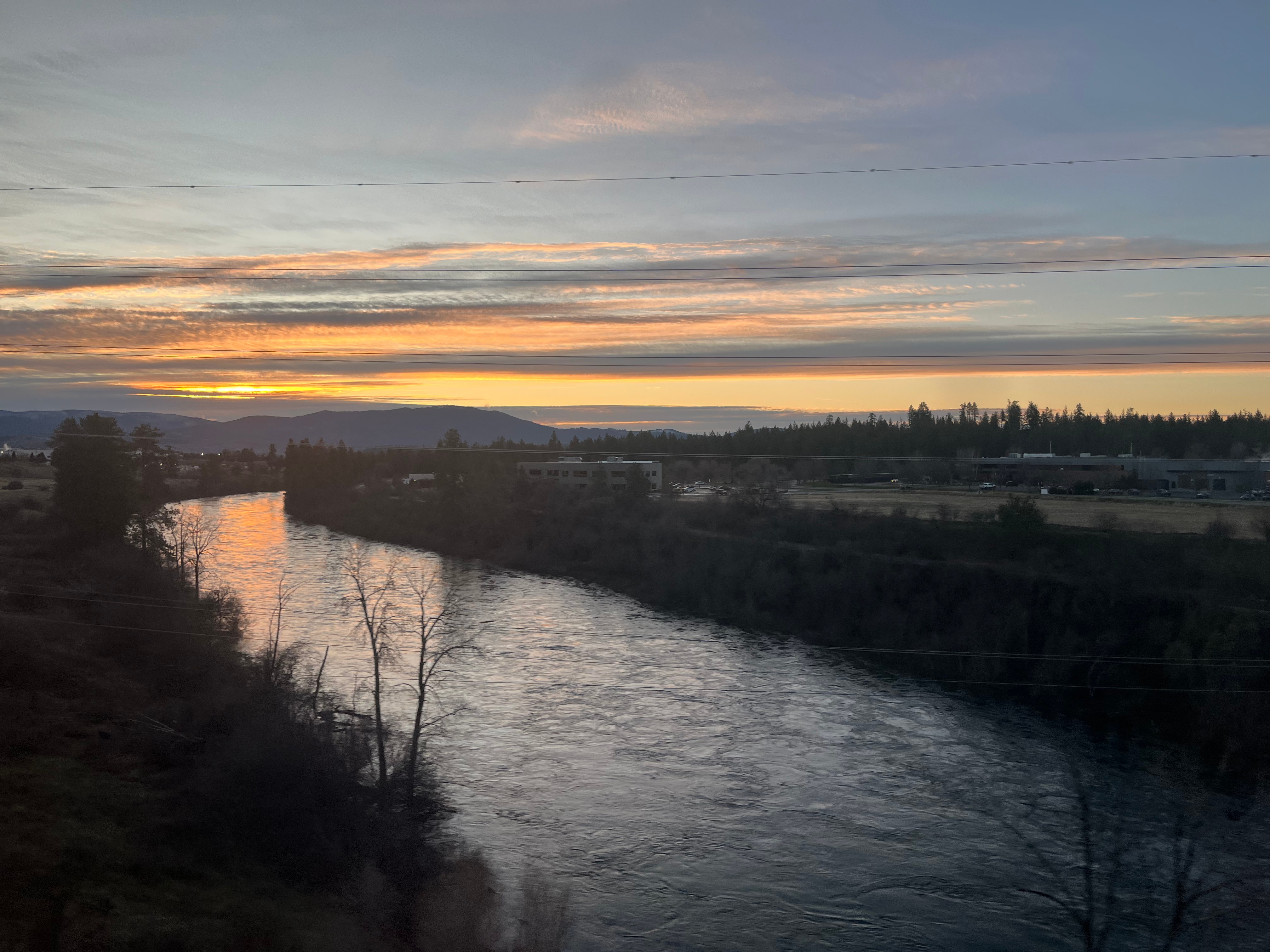 At 2:30, we got our own ridiculously loud boarding announcement. It was on time, which was much to my surprise after my two-hour-late California Zephyr experience. Because the train splits into Portland and Seattle sections later on, boarding was done in a very specific order to ensure everyone ended up in the correct cars. Once onboard and settled into our room, we were immediately glad we’d upgraded. I don’t know if we would have been on speaking terms after the trip if we had tried to squeeze into the roomette. We made it out of the city pretty quickly and headed into the suburbs, which had a lot of trees and houses covered with snow. We also saw the occasional frozen lake or pond, which is kind of a foreign concept to two people from Texas. We also saw a lot of deer, which is less of a foreign concept, but always fun to point out anyway.