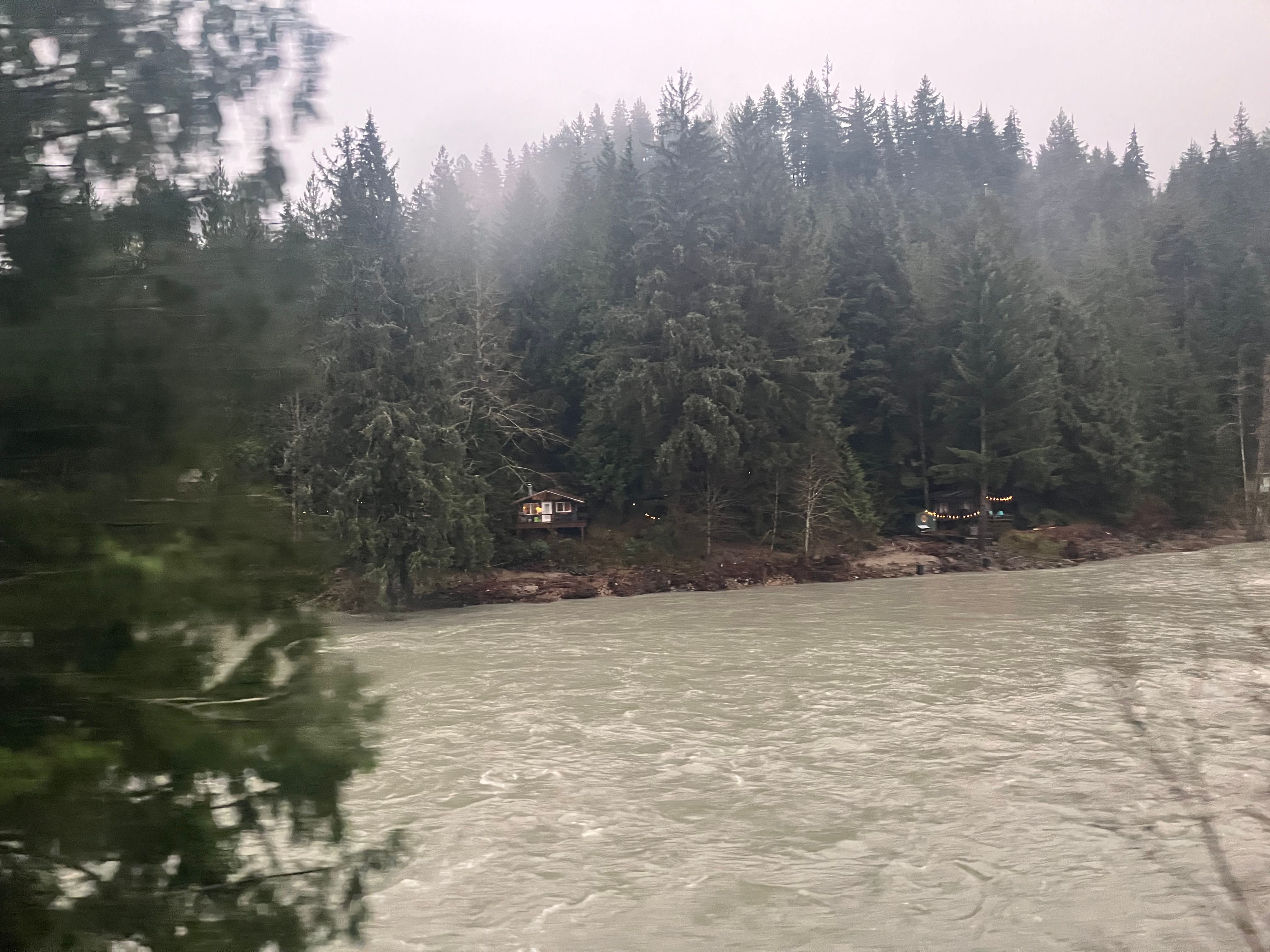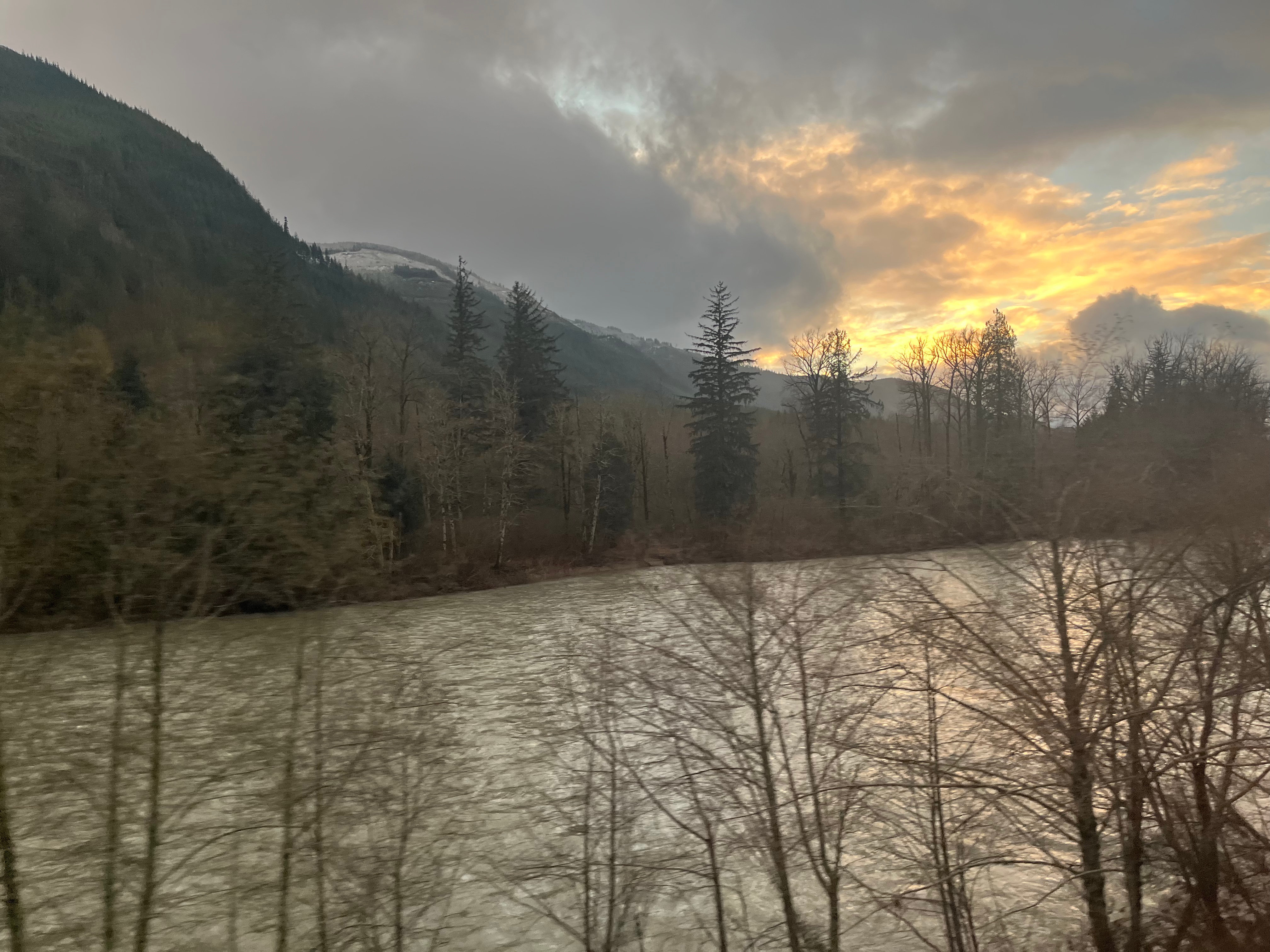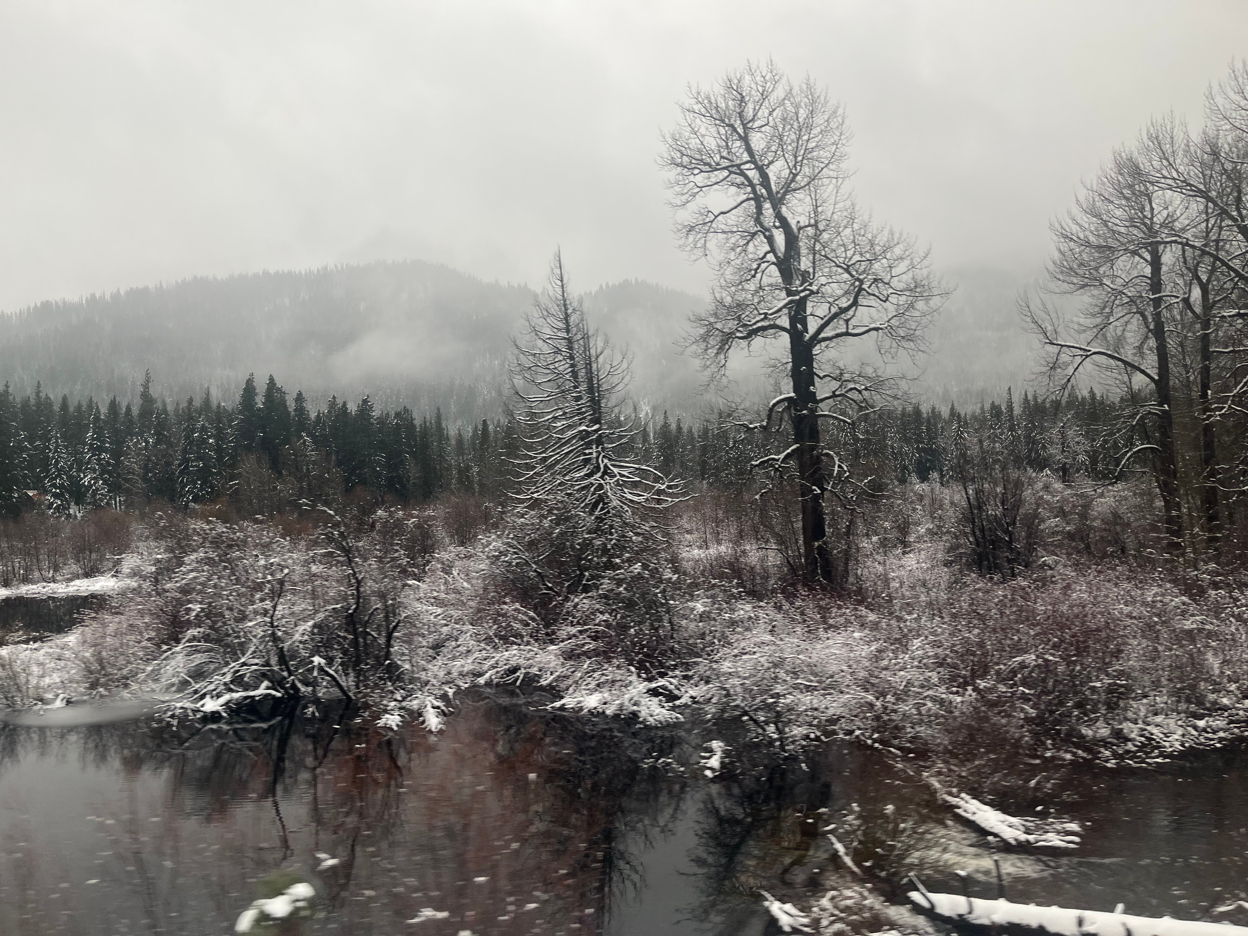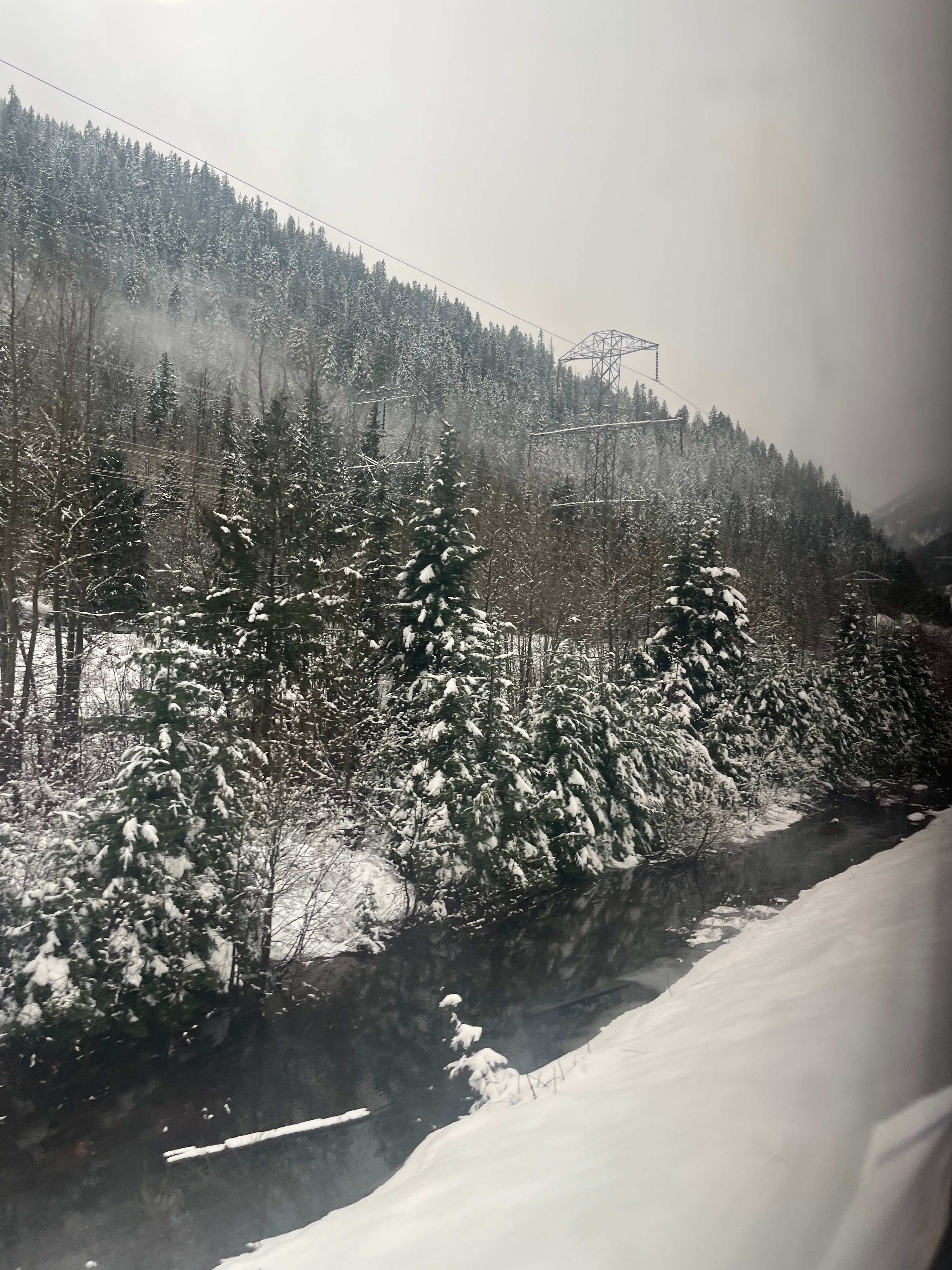 Between meals, my brother and I took in the scenery, especially the snow-covered mountains and trees we saw while waiting outside the Cascade Tunnel. For those unfamiliar, the Cascade Tunnel is similar to the Moffat Tunnel on the California Zephyr in that it’s so long that diesel exhaust builds up inside. However, unlike on the Zephyr where passengers are told not to move between cars, no such announcement was made here. Instead, trains on this route must wait about 15 minutes after the previous train exits so the ventilation system can clear the tunnel. In true Amtrak fashion, two freight trains were routed through ahead of us, adding yet another delay.